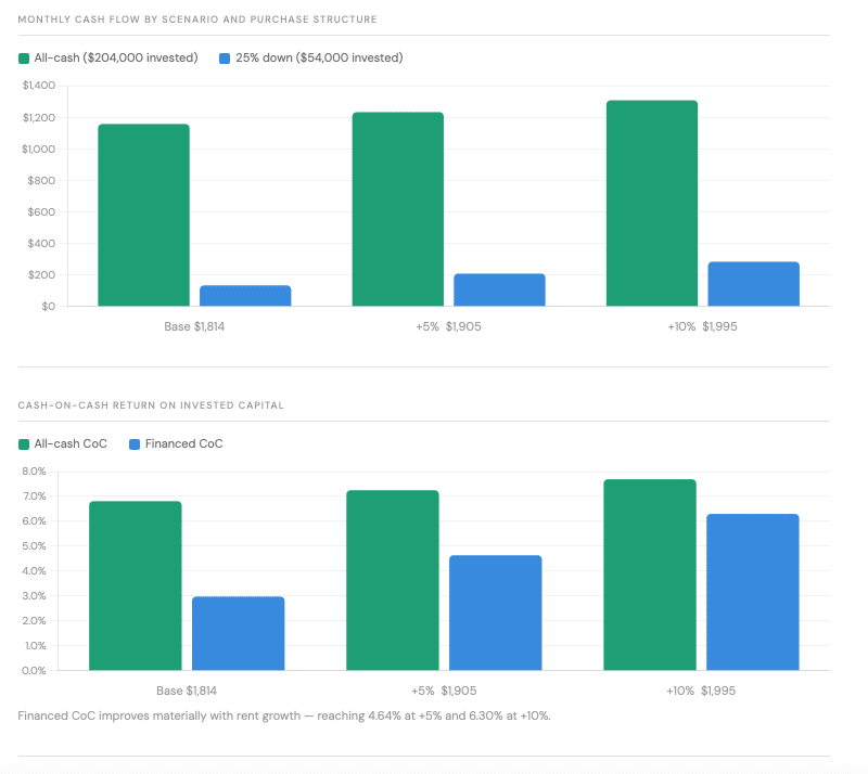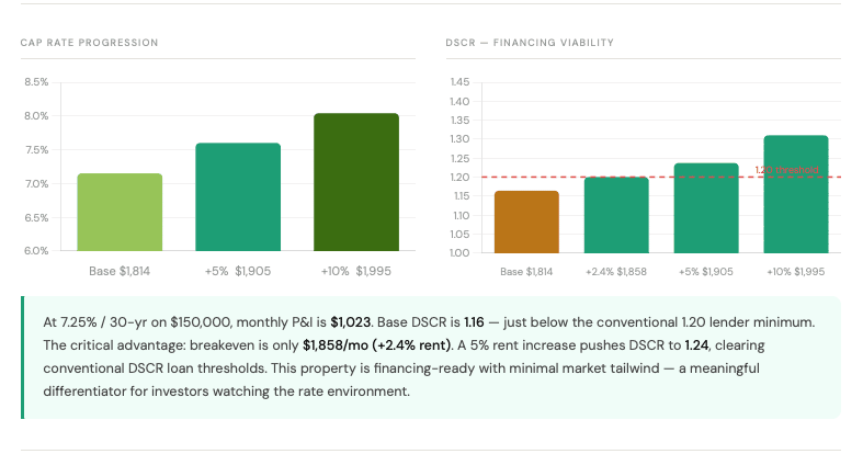 👉 That’s ~$220/month additional potential without stretching assumptions. 4. Financing-Ready with Minimal Rent Growth Most deals fail here.